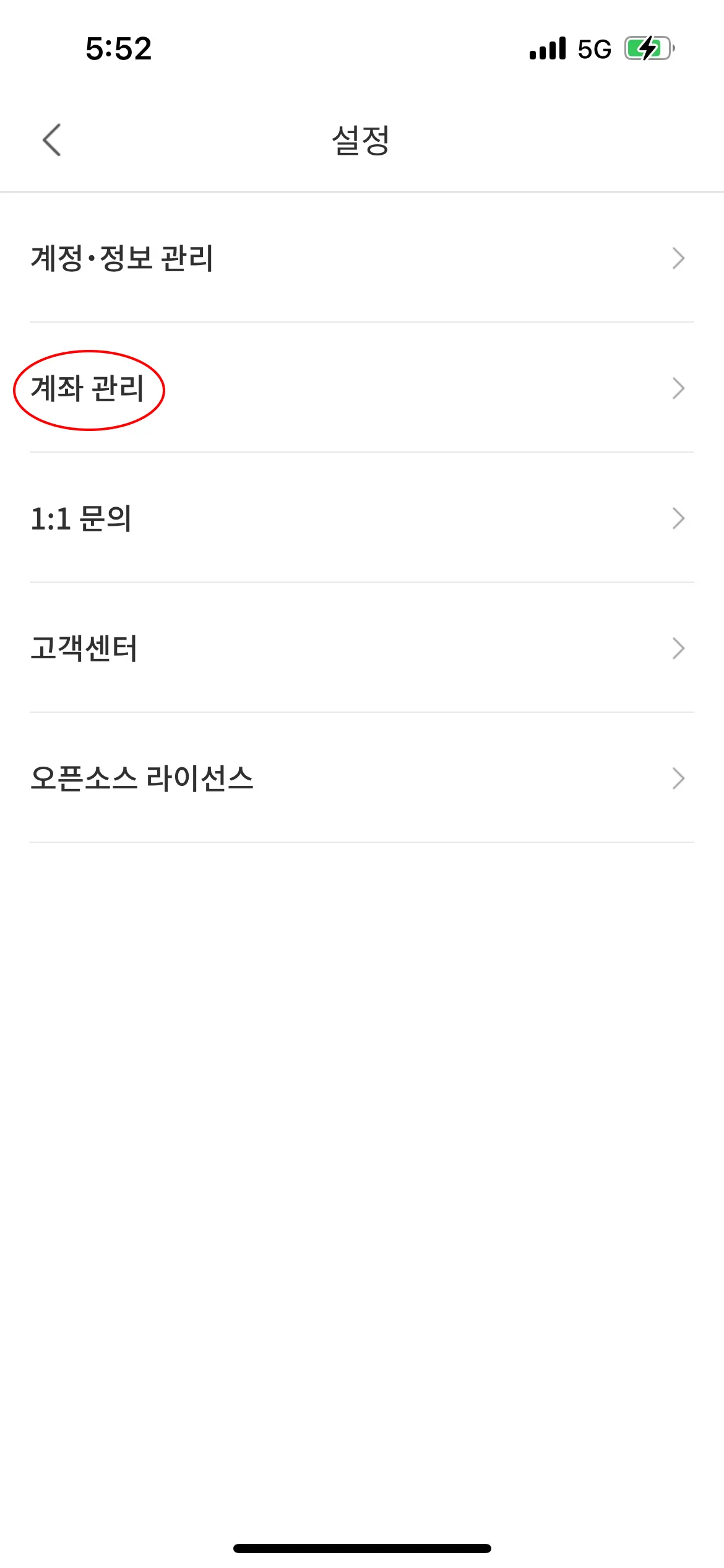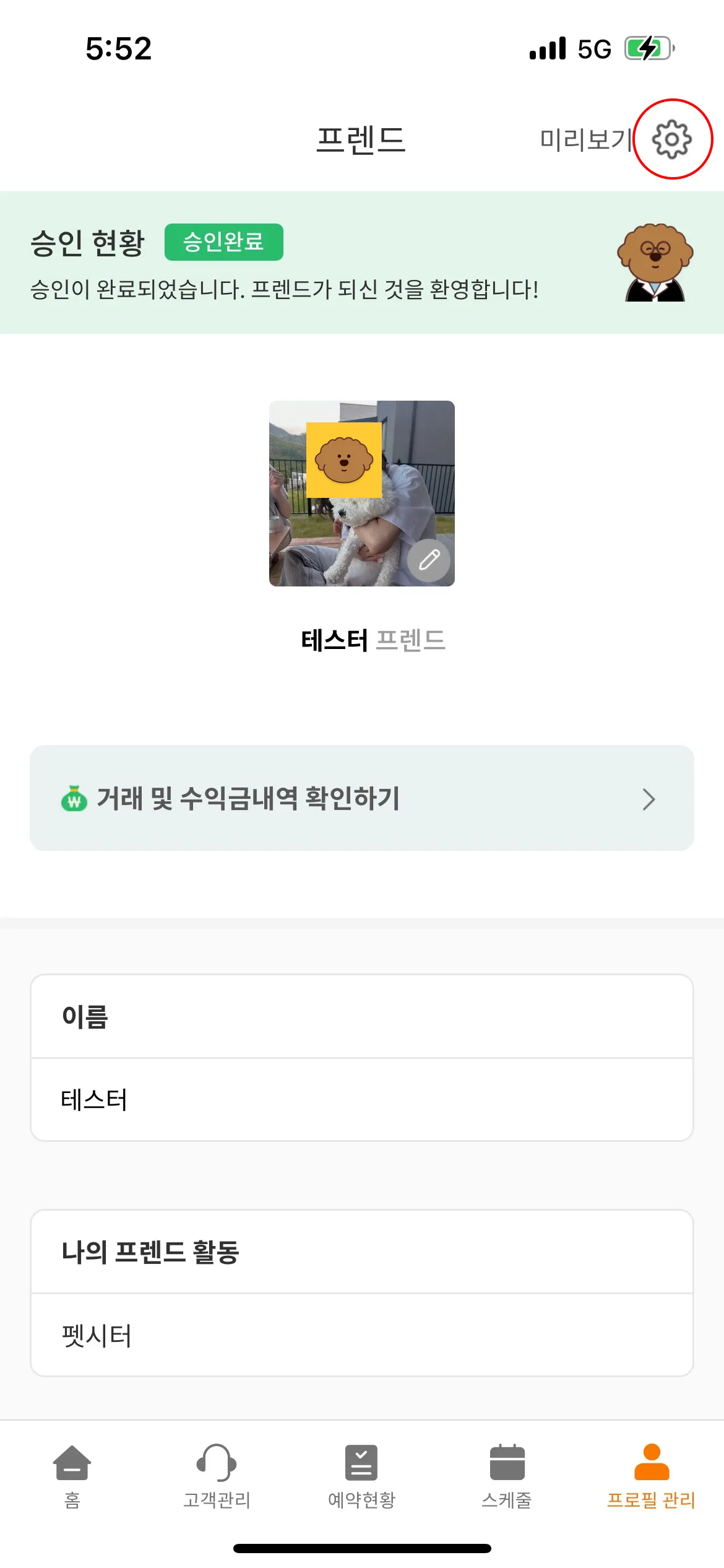 “프렌드 홈 > 프로필 관리 > 설정(톱니바퀴 아이콘) > 계좌 관리”