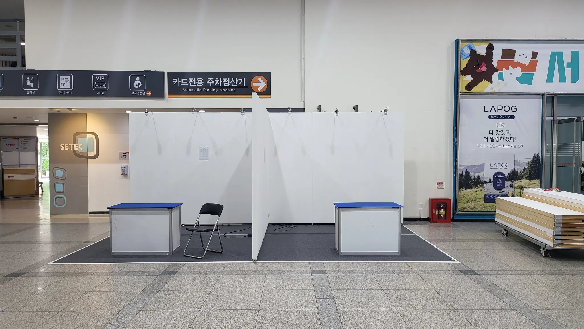 부스 디자인의 마지막은 부스 내 시설물 배치겠죠? 테이블 2개, TV 1대, 의자 4개, 차단봉 3개, X 배너 등을 준비했습니다.