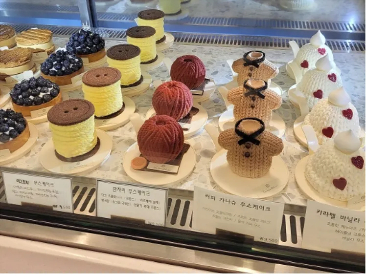 르몽블랑의 메뉴입니다. 기본적인 커피류와 티, 에이드 주문이 가능해요. 르몽블랑은 케이크로 유명한 만큼 다양한 디저트 케이크가 준비되어 있어요. 스웨터나 털실을 연상하게 하는 독특한 디지인의 케이크들이 눈에 띄는데요, 하나같이 너무 아기자기하고 예뻐서 뭘 먹어야할지 넘 고민되더라구요ㅎㅎ