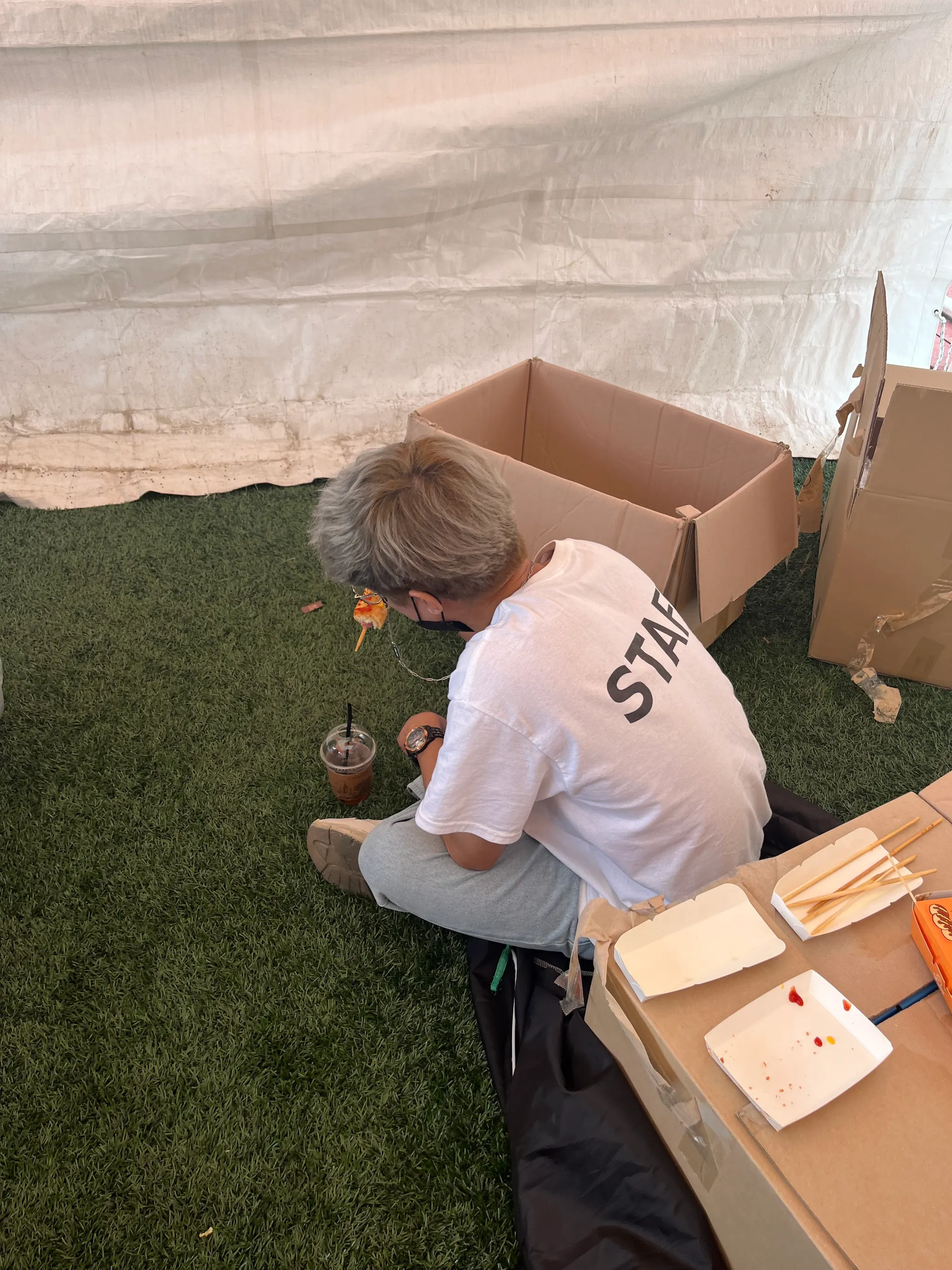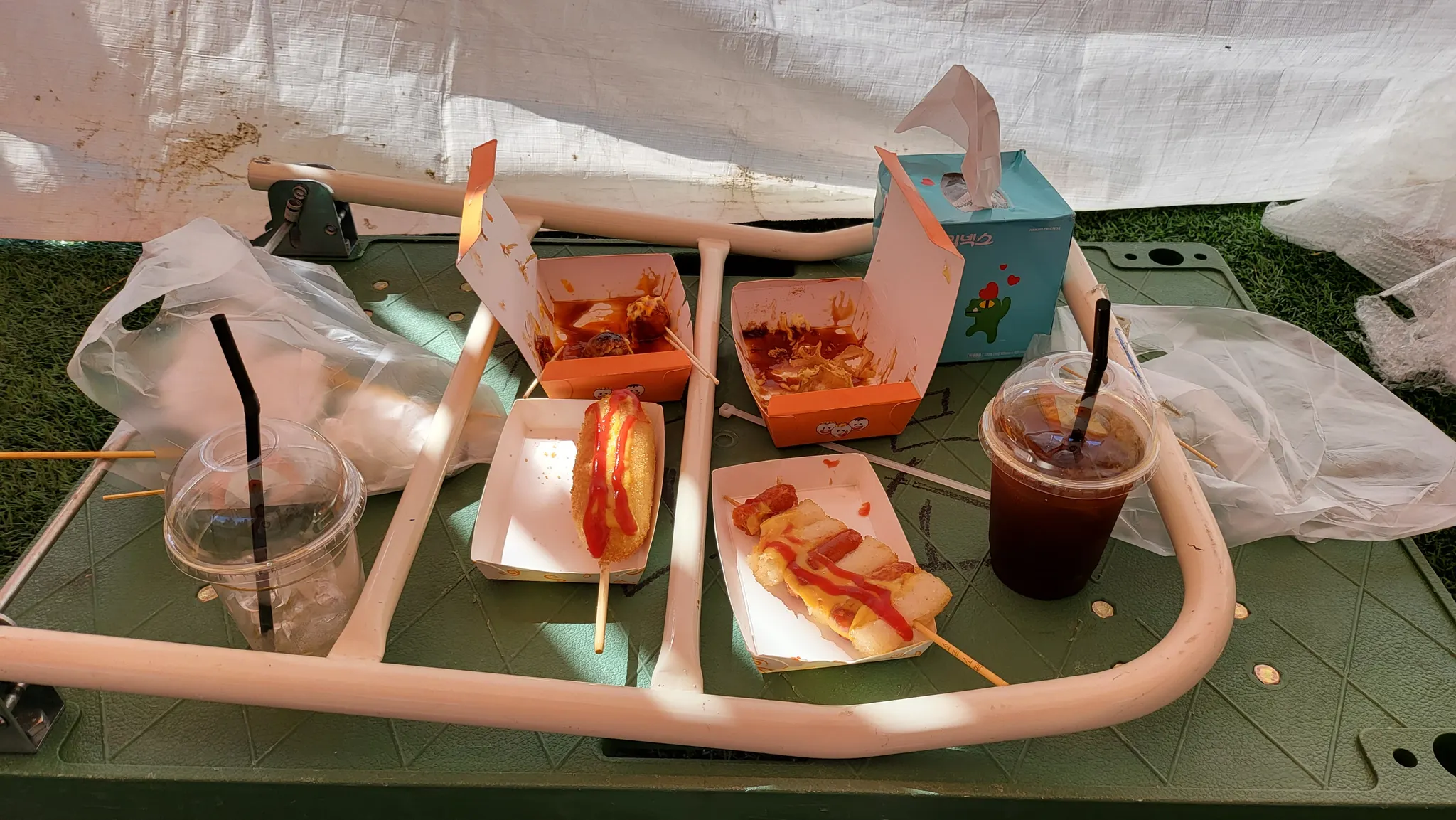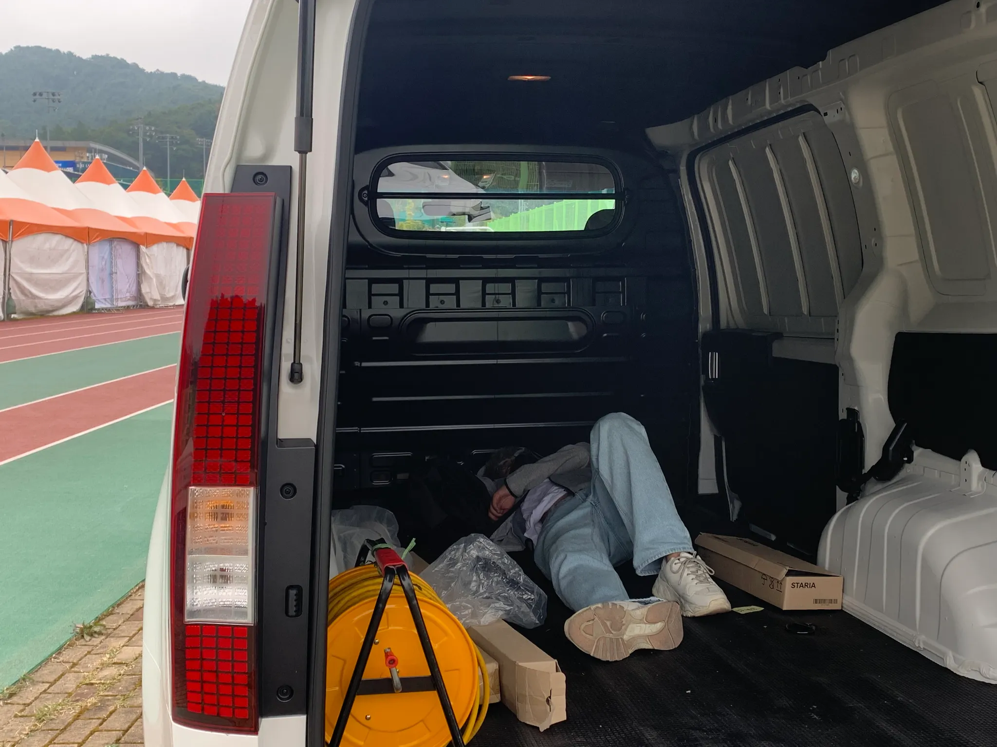 행사장에서 점심을 먹을 수 있는 곳이 없었던 것은 아쉬웠어요. 그래서 이틀동안 핫도그, 소떡소떡, 타코야끼로 끼니를 해결했고, 피곤할 때는… 차 짐칸에서 잠깐 누워있고 했답니다. 먹는 모습이 왜 이렇게 처량해 보일까요..? ㅎ.ㅎ 차에서 자는 모습도 정말 부끄럽네요…