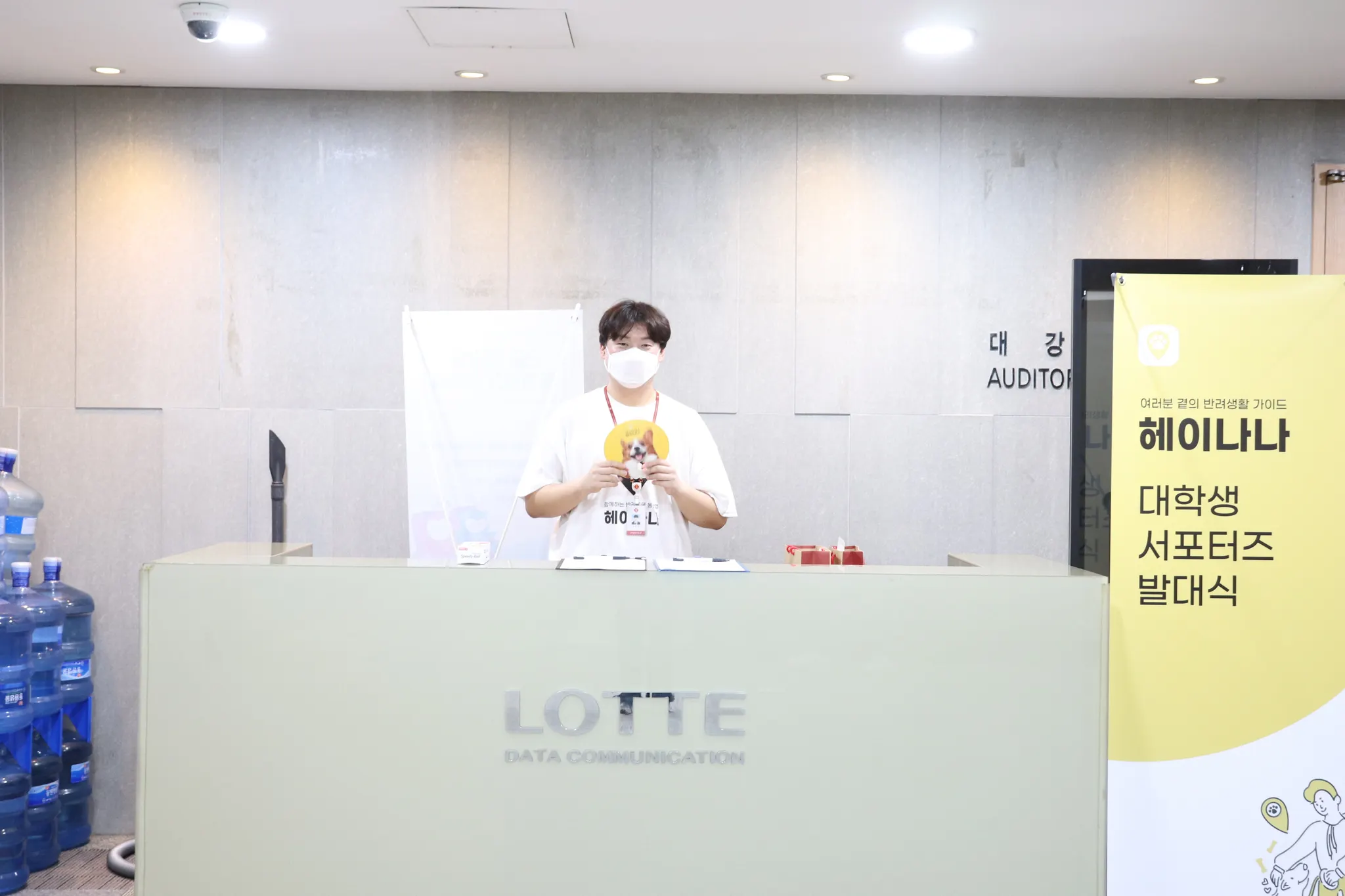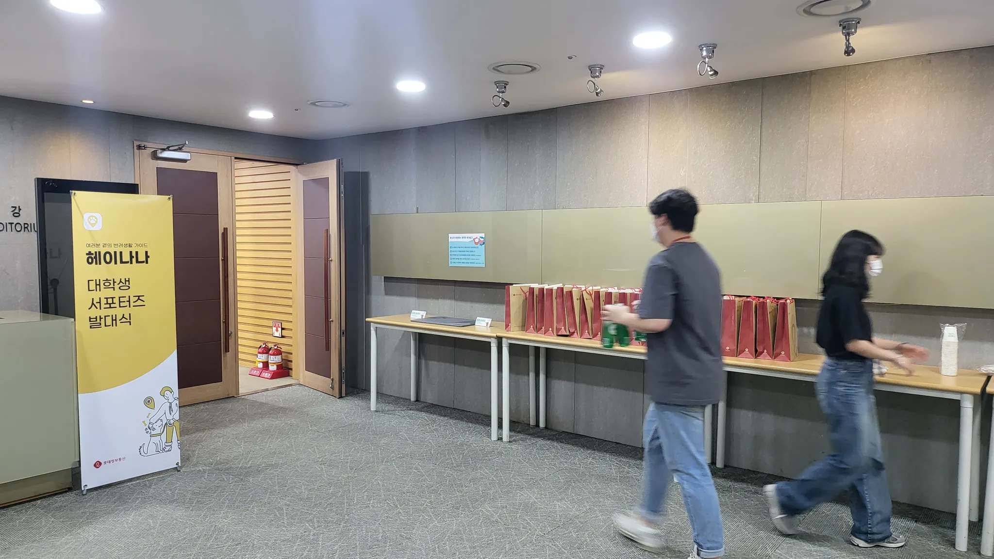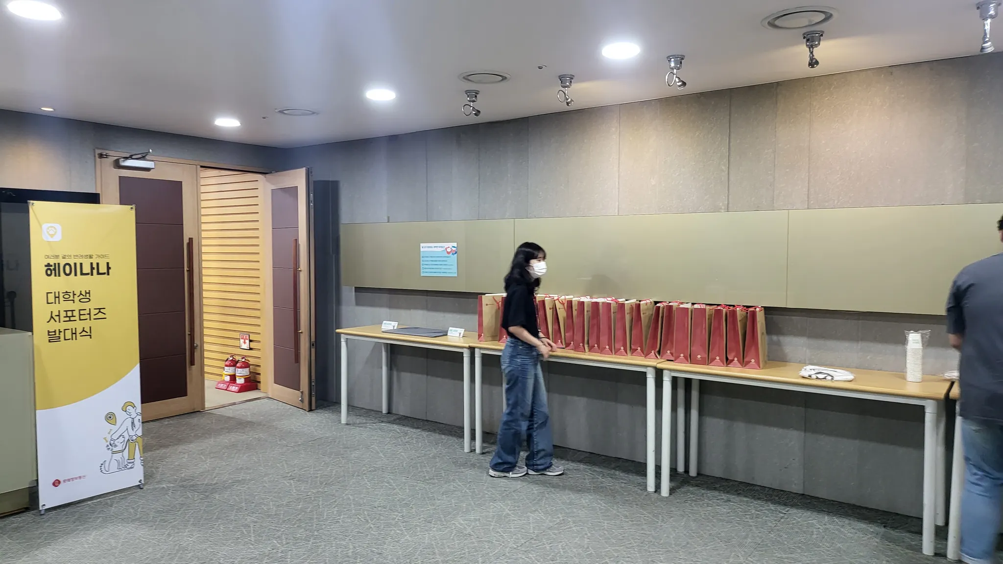 전날까지 준비했던 X배너, 서류 가방, 음료 등을 대강당에 배치했습니다.