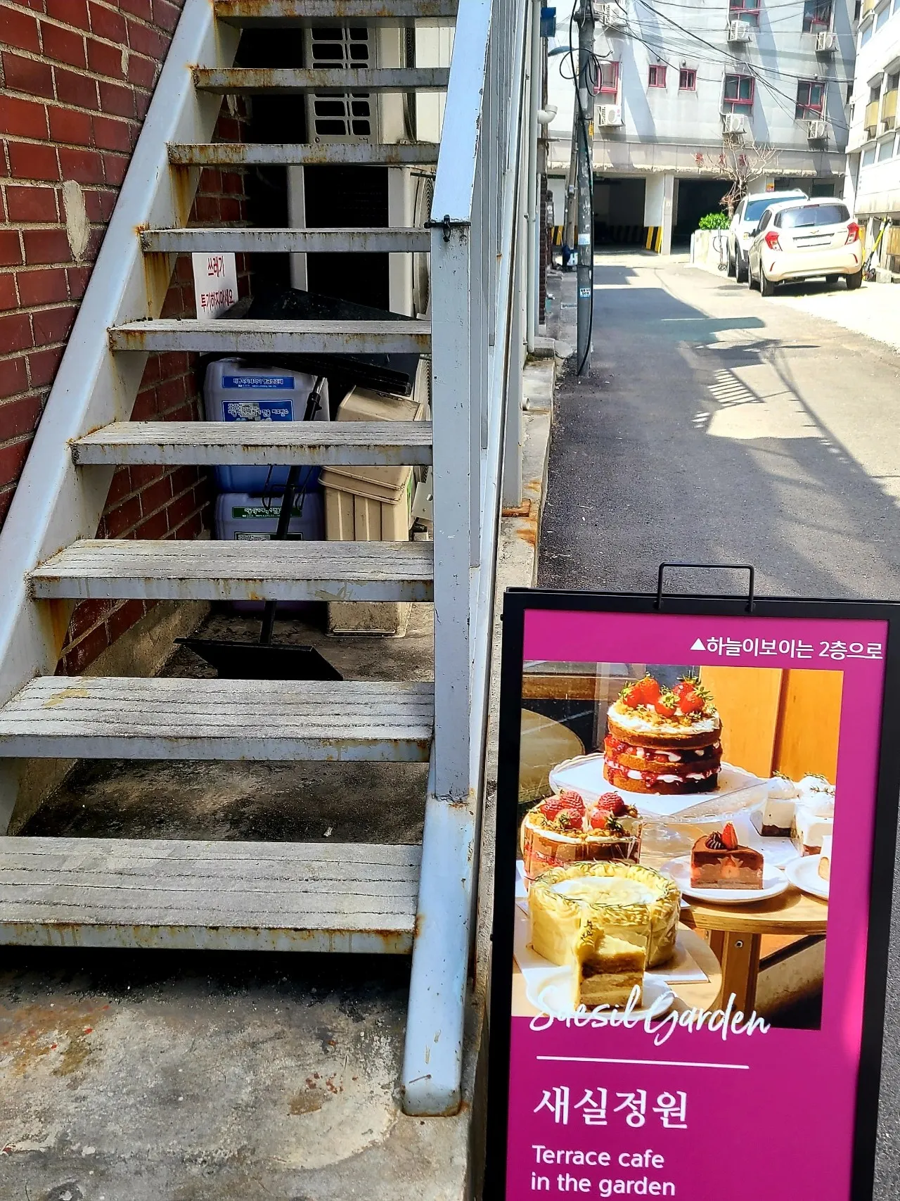 계단을 올라가면 첫 번째 테라스 좌석과, 새실정원의 입구를 찾을 수 있어요.
