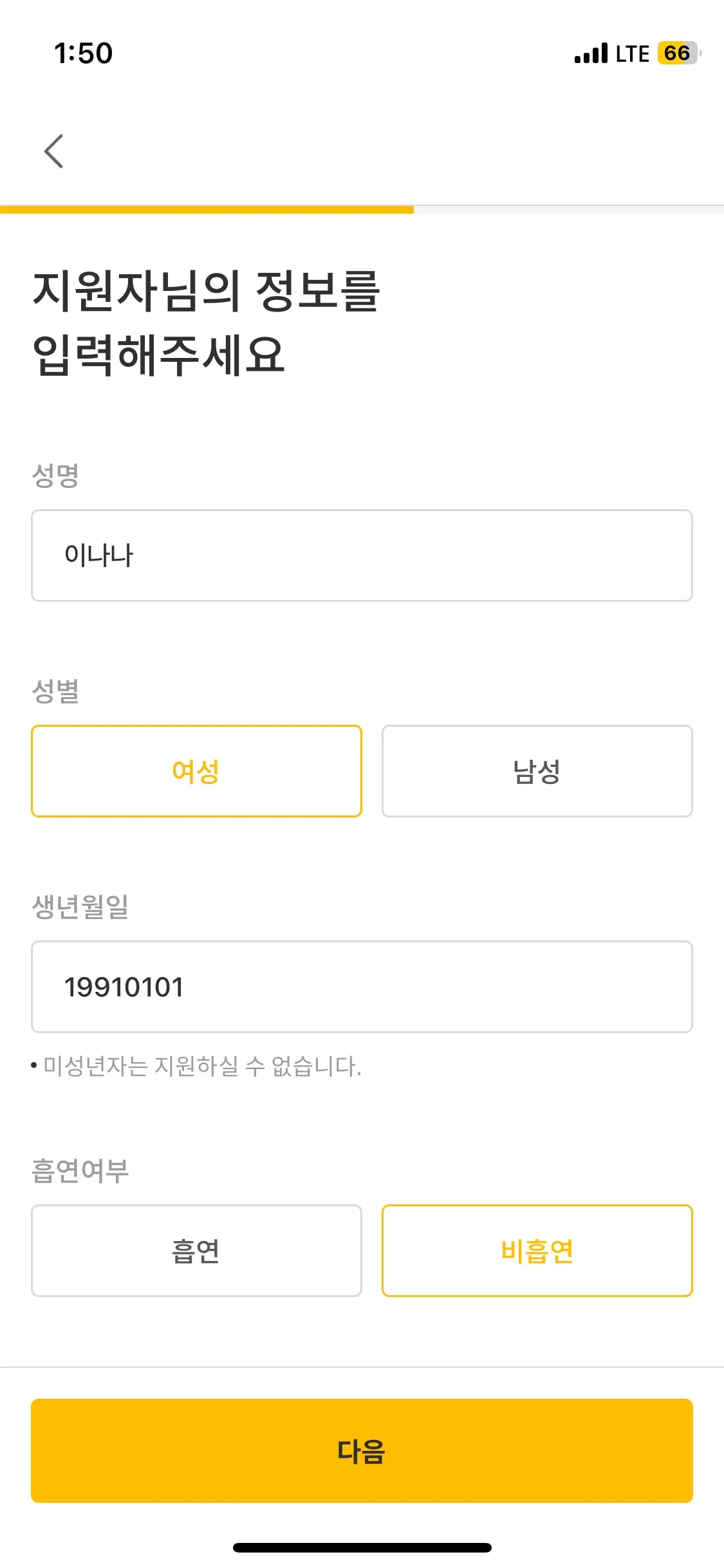 7. 성명, 성별, 나이, 흡연 여부, 양육 경력, 펫시터 경력, 지원 돌봄 종류를 입력해요.