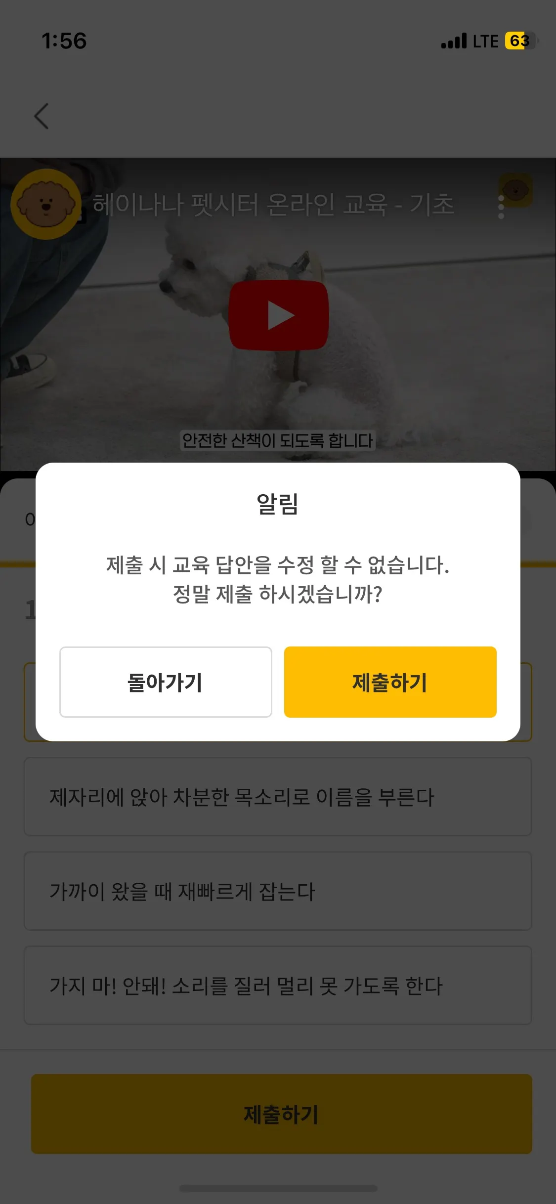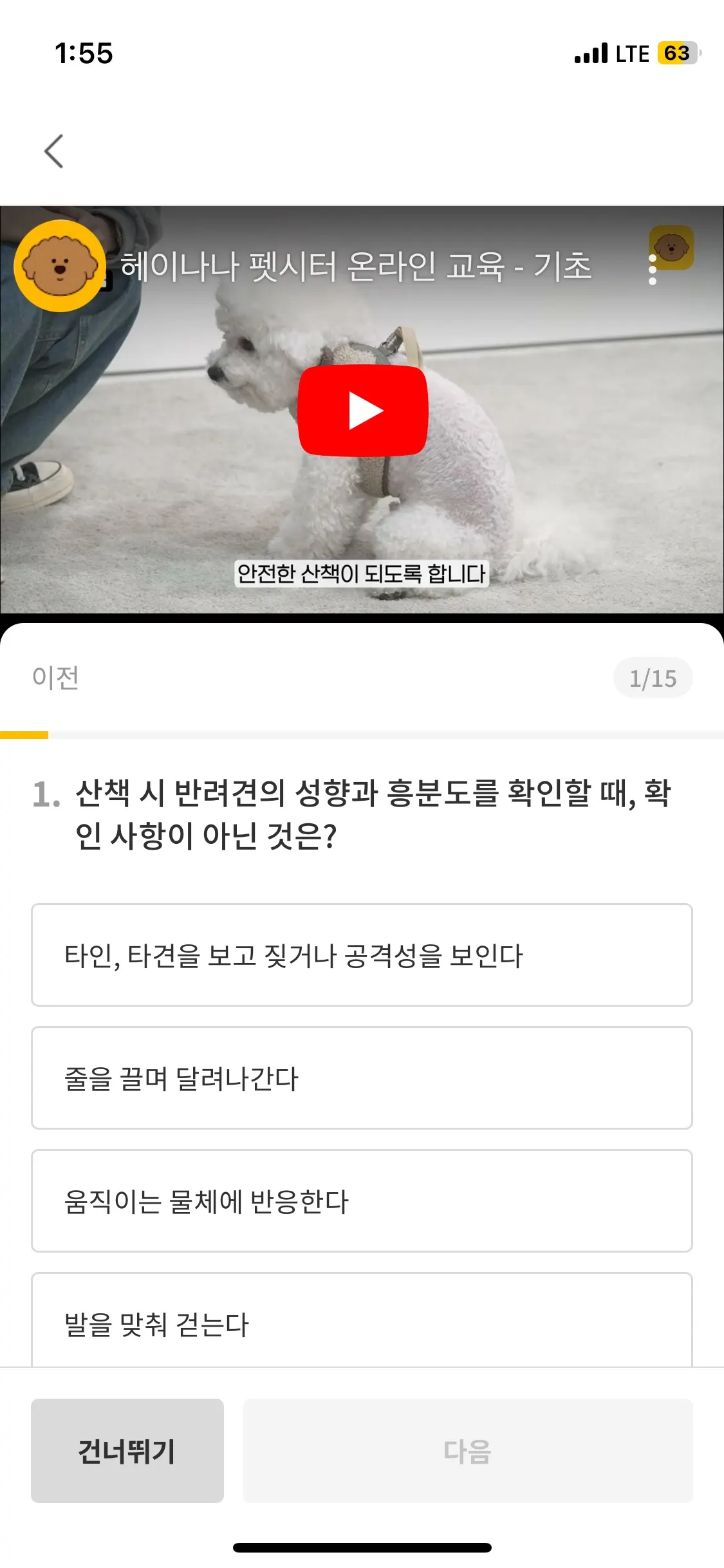 9. 펫시터 온라인 교육 영상을 보고 시험에 응시해요. 불합격 시 일주일 후에 재응시가 가능하니 꼭 영상을 꼼꼼히 보며 시험에 응시해주세요.