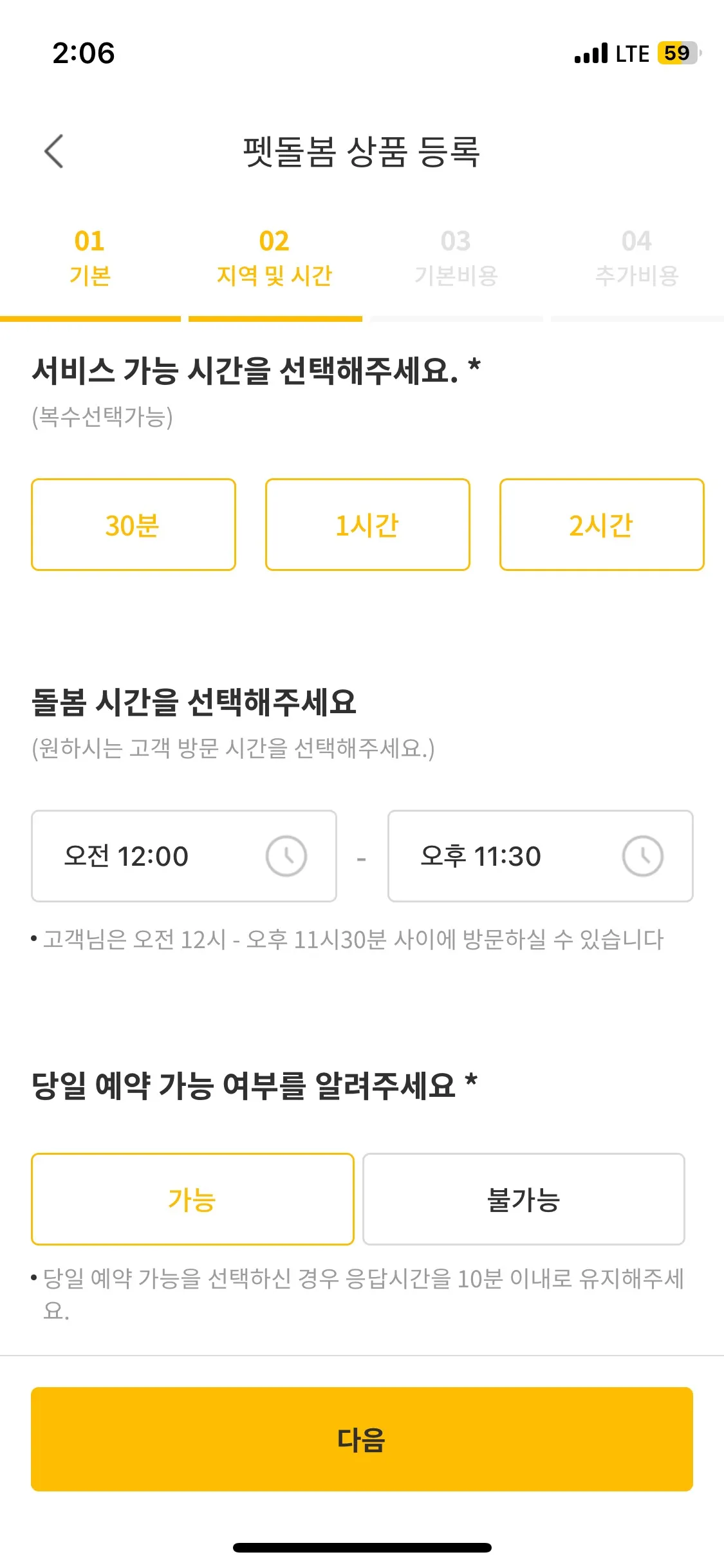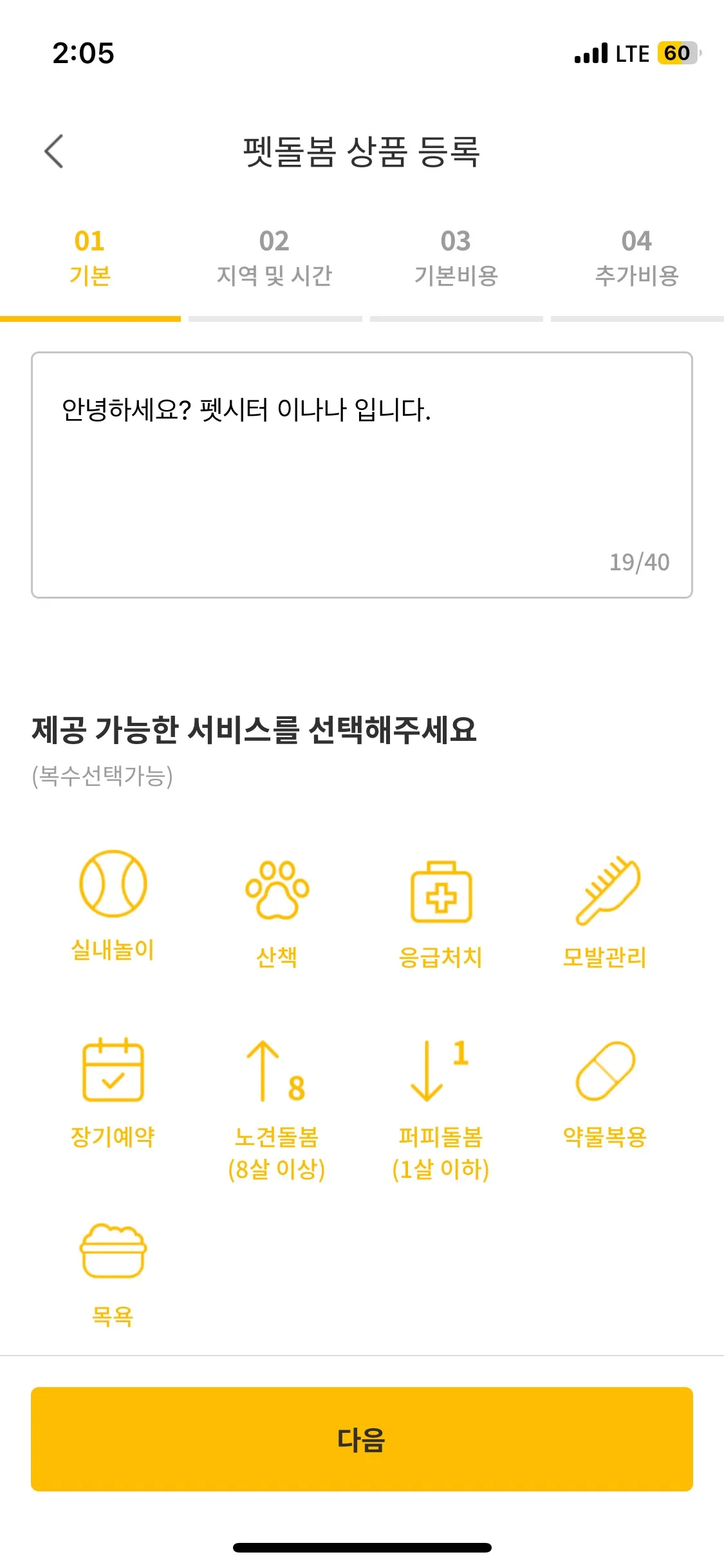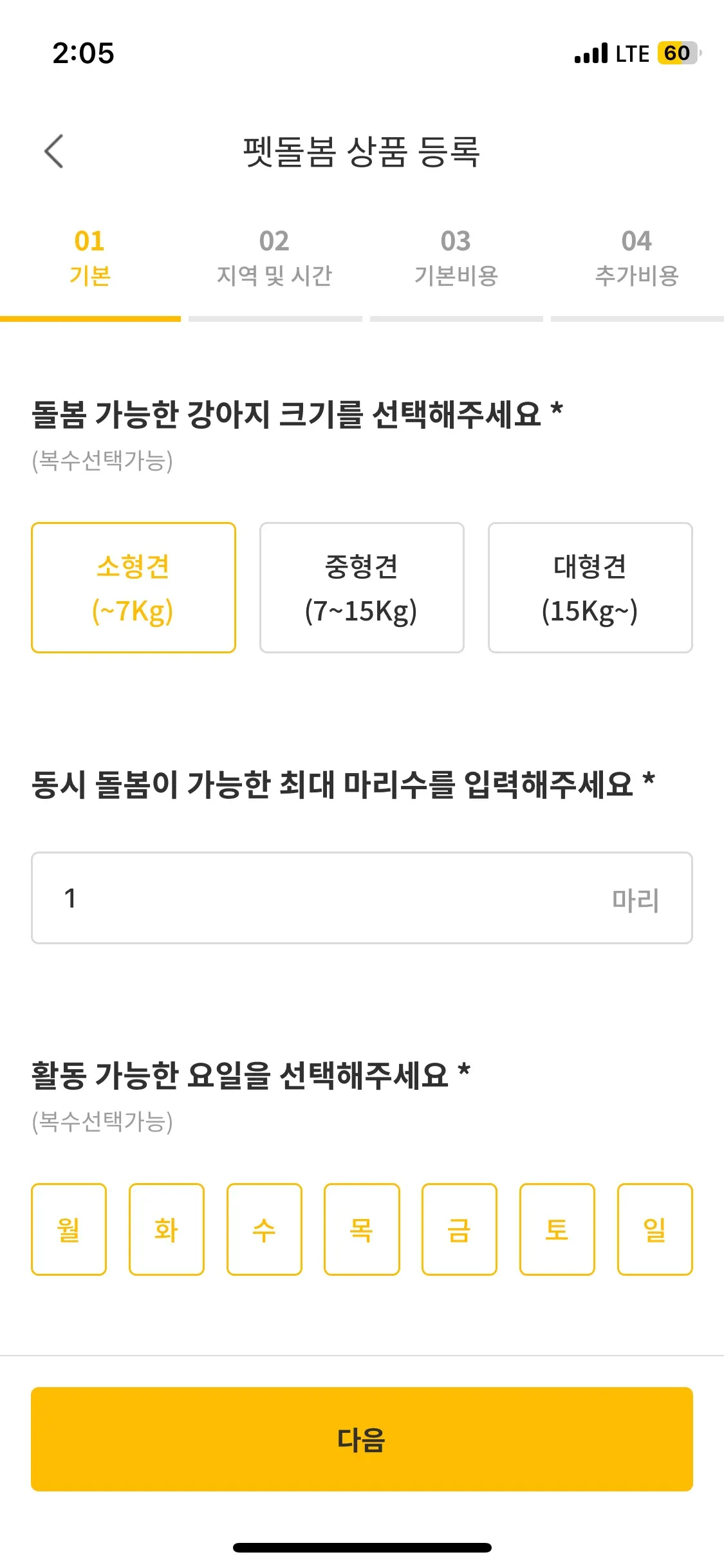 12. 펫돌봄 상품을 입력해요. 크기, 마리수, 활동 요일, 자기소개, 제공 서비스, 돌봄 지역, 서비스 가능 시간, 돌봄 가능 시간, 당일 예약 여부, 돌봄 비용, 추가비용