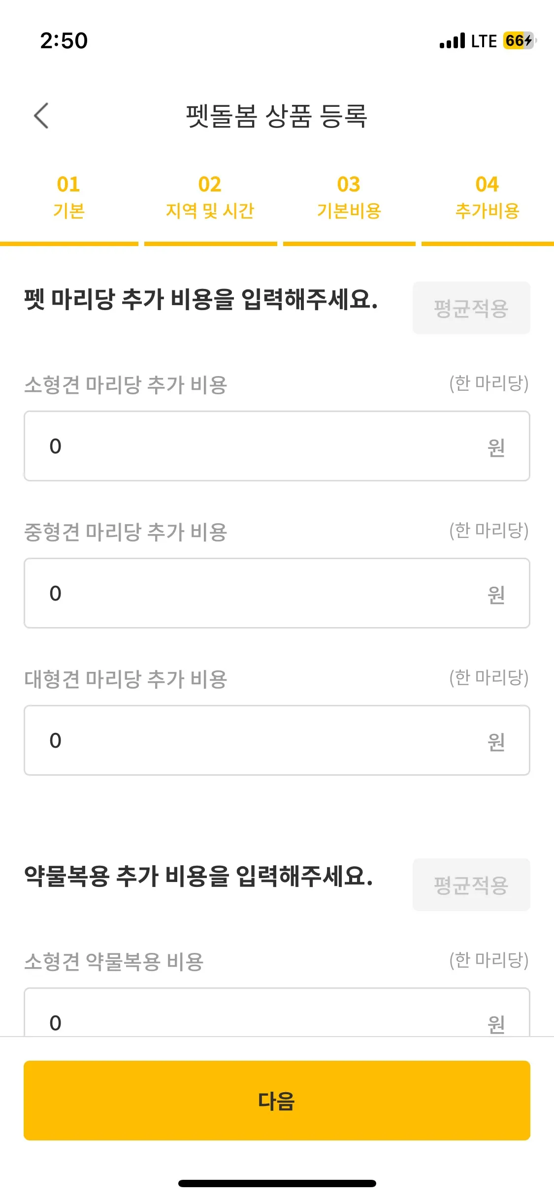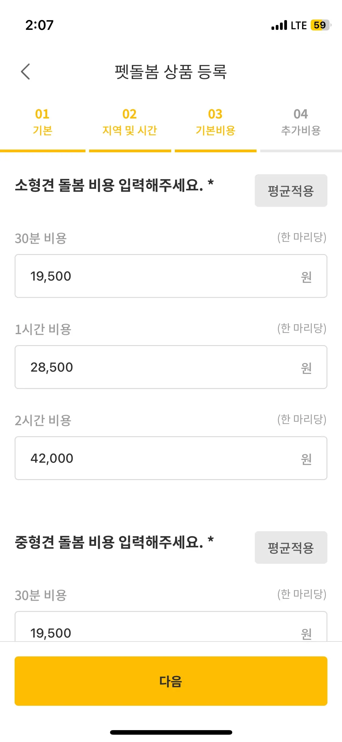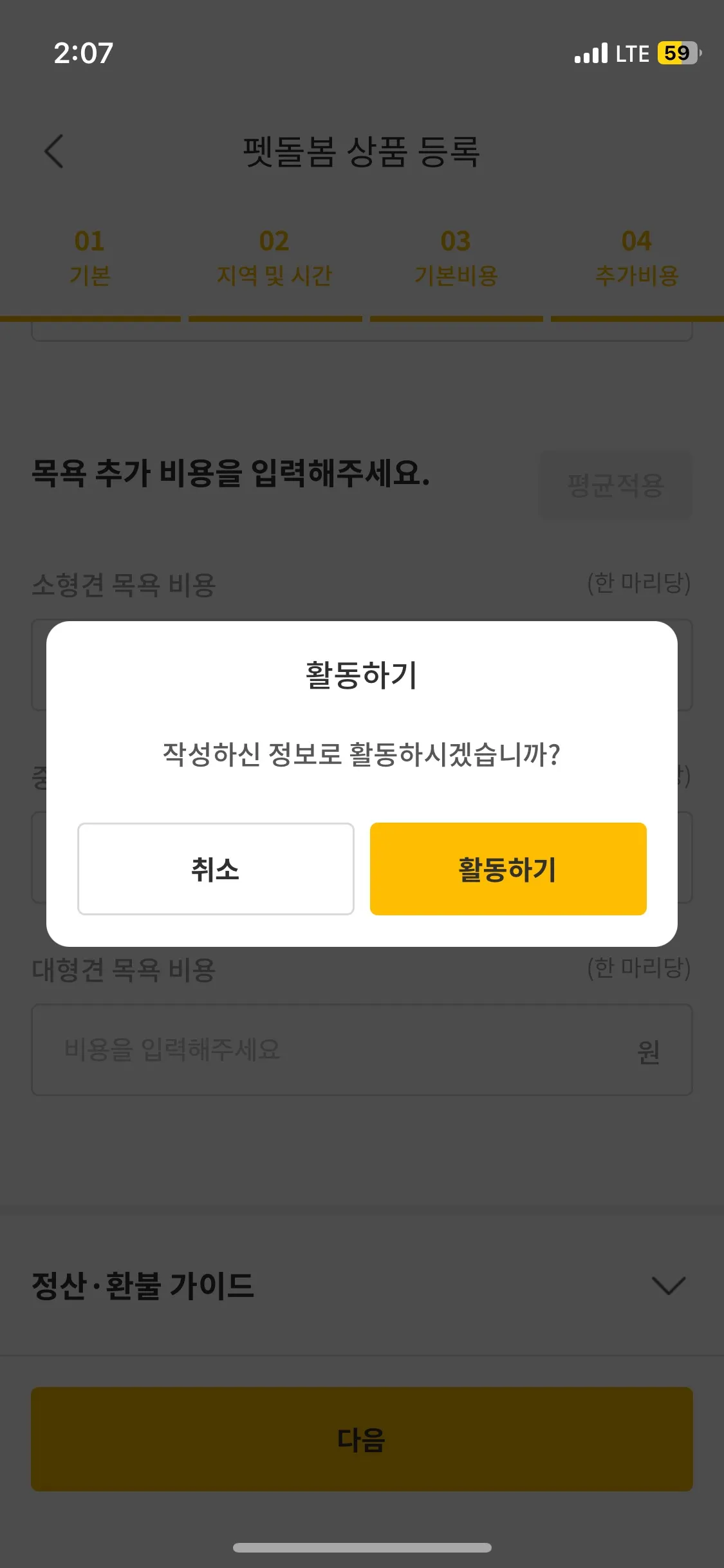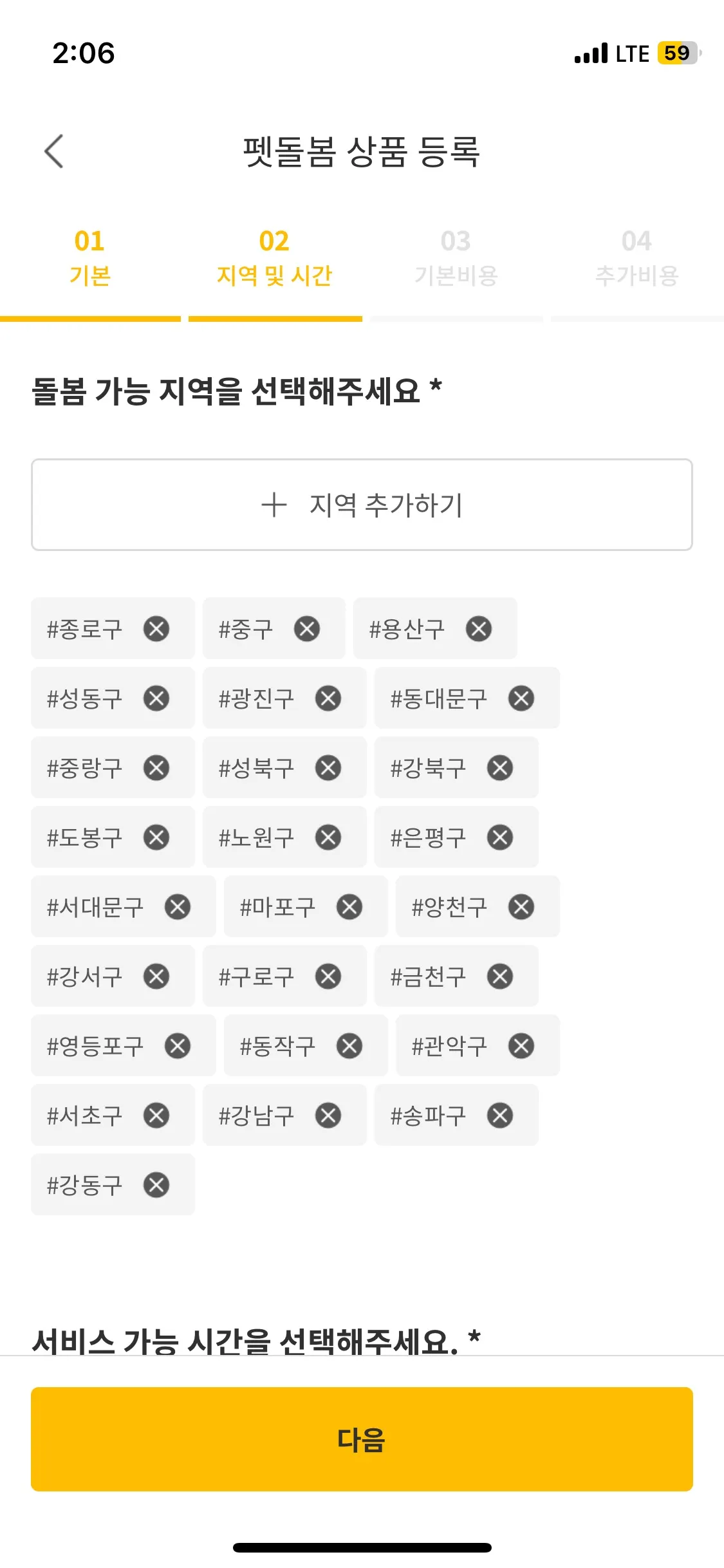 12. 펫돌봄 상품을 입력해요. 크기, 마리수, 활동 요일, 자기소개, 제공 서비스, 돌봄 지역, 서비스 가능 시간, 돌봄 가능 시간, 당일 예약 여부, 돌봄 비용, 추가비용