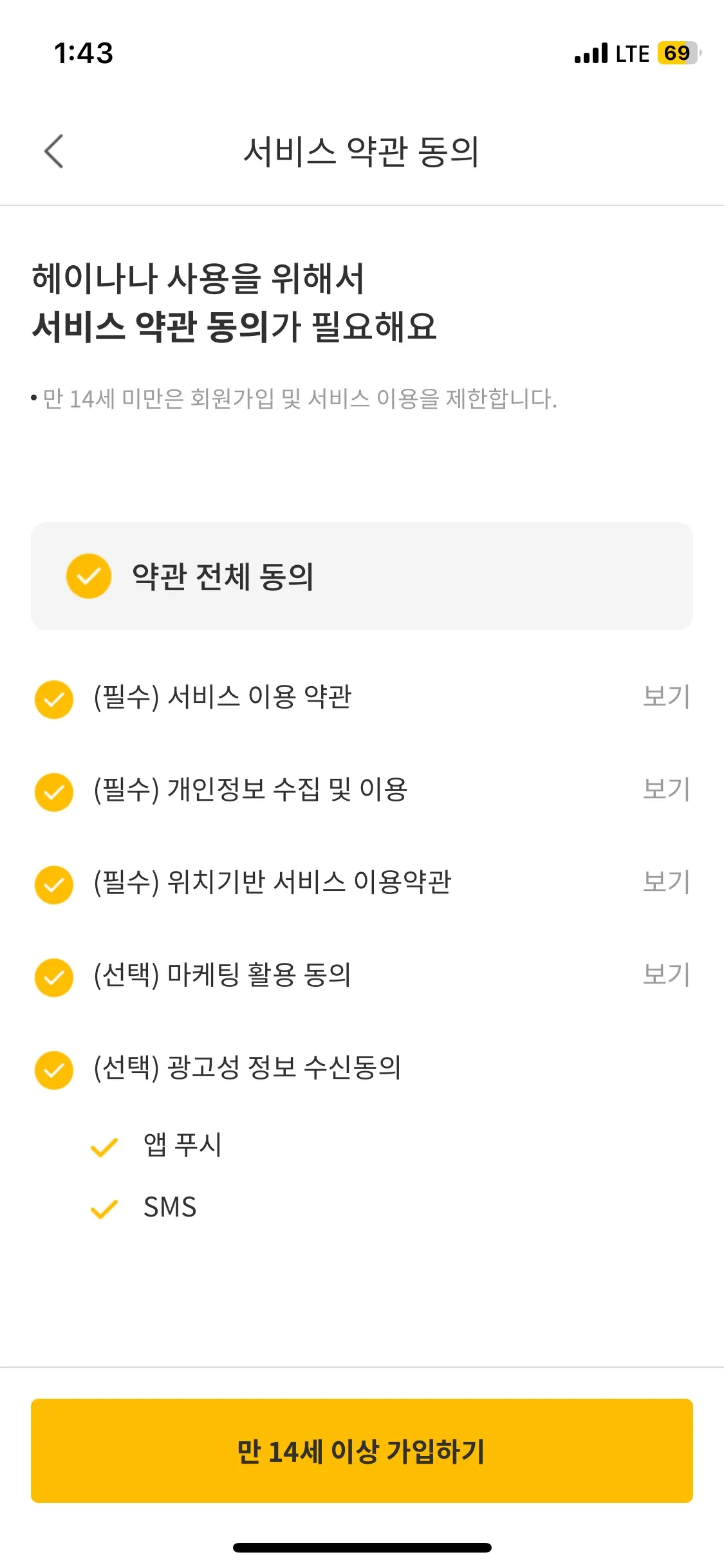 2. 헤이나나 사용을 위해서 “서비스 약관 동의”가 필요해요.