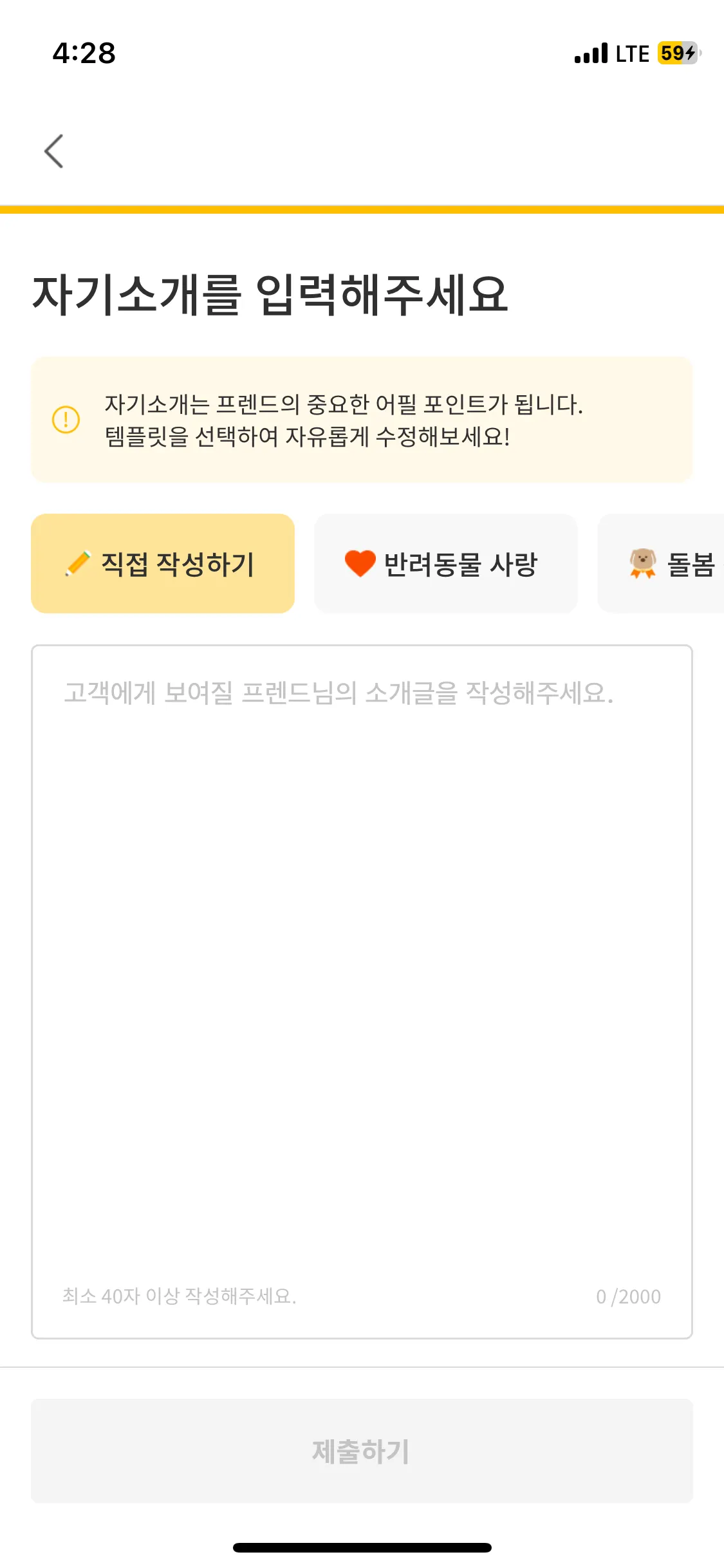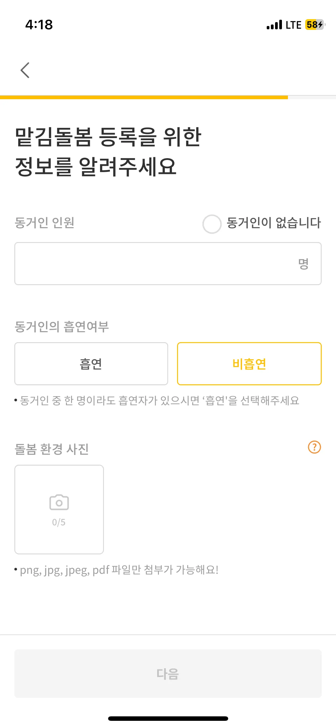 8. 맡김 돌봄을 위한 정보와 자기소개를 입력 후 제출해요.