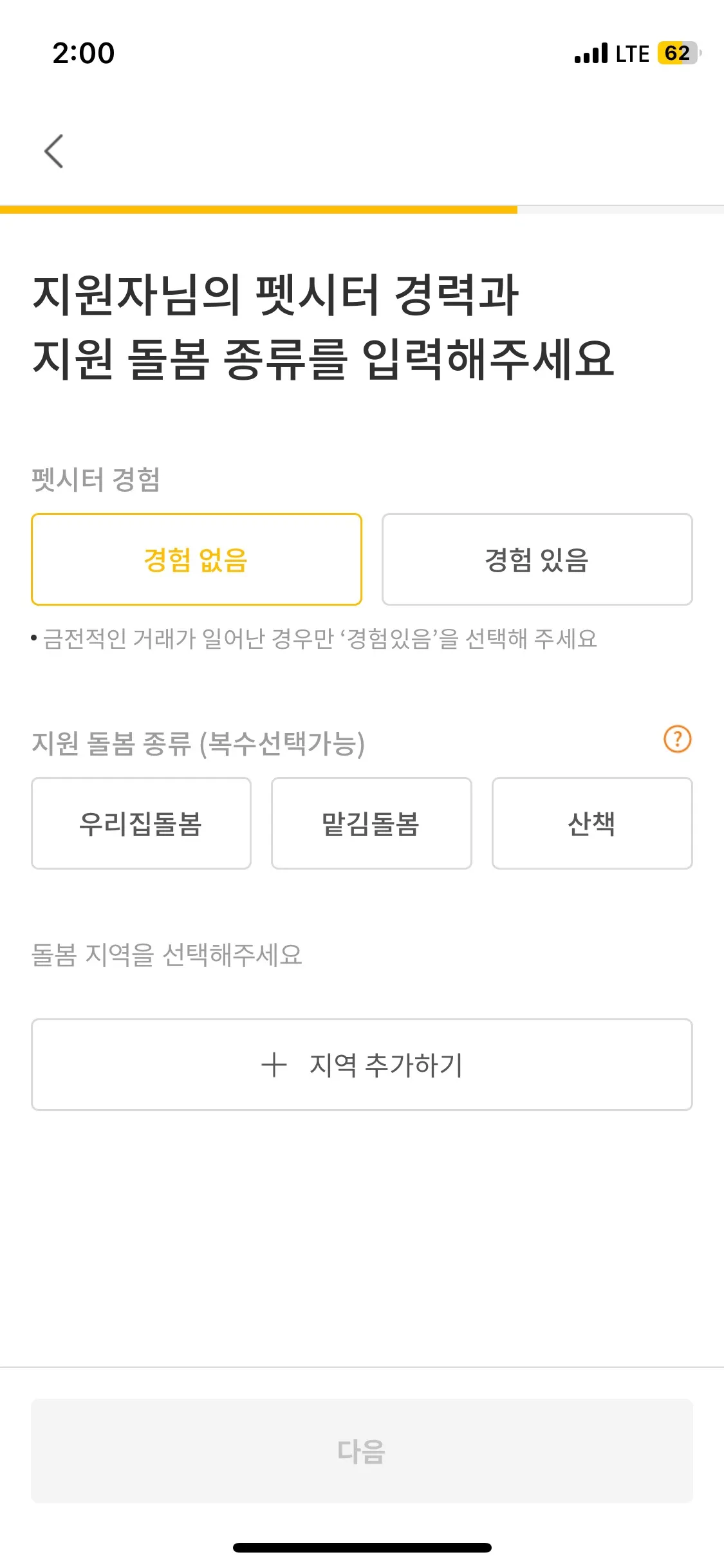 13. 우리집돌봄과 산책돌봄 서비스가 오픈 된 것을 볼 수 있어요. 맡김돌봄의 경우 별도로 작성이 필요해요.