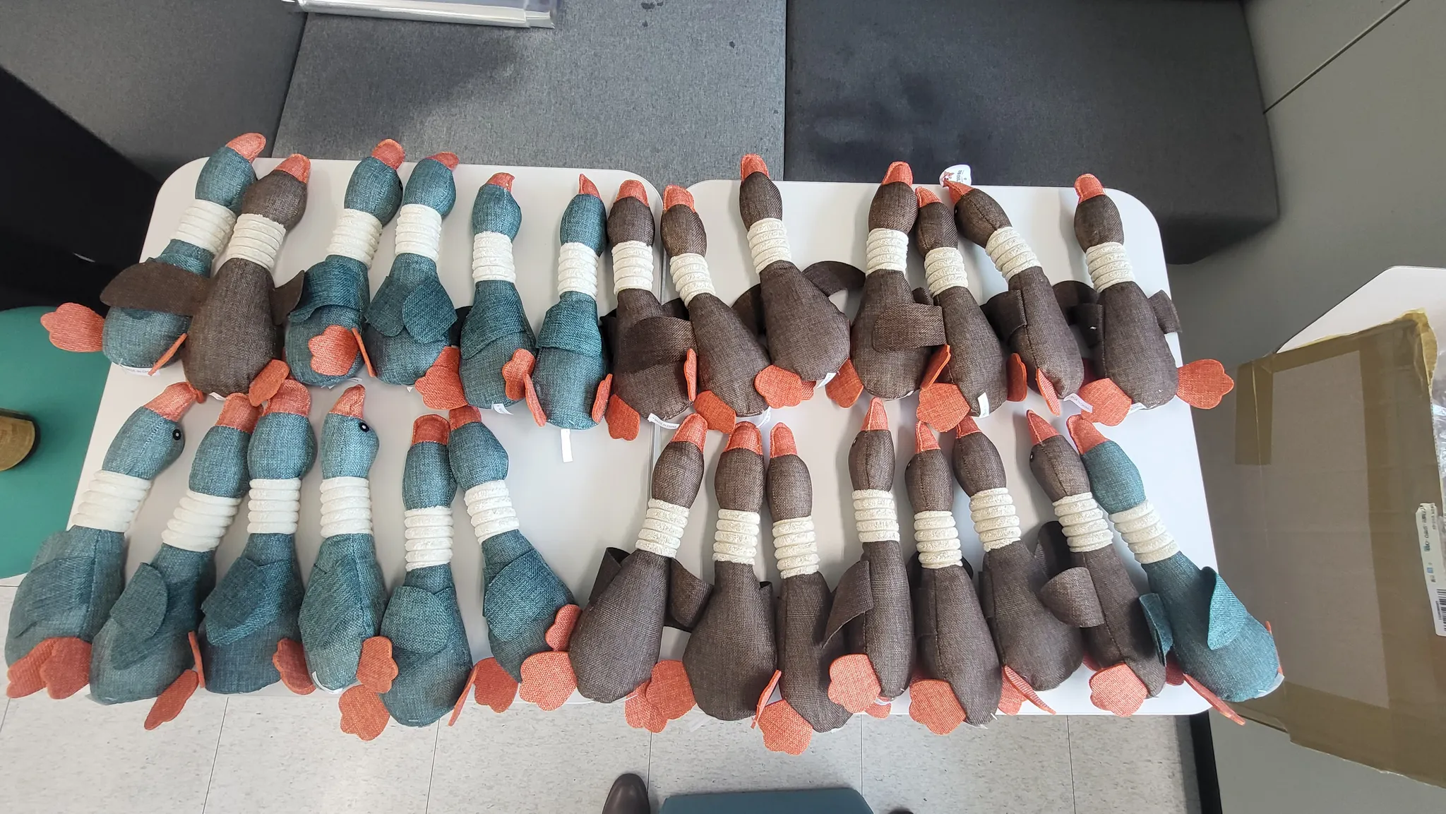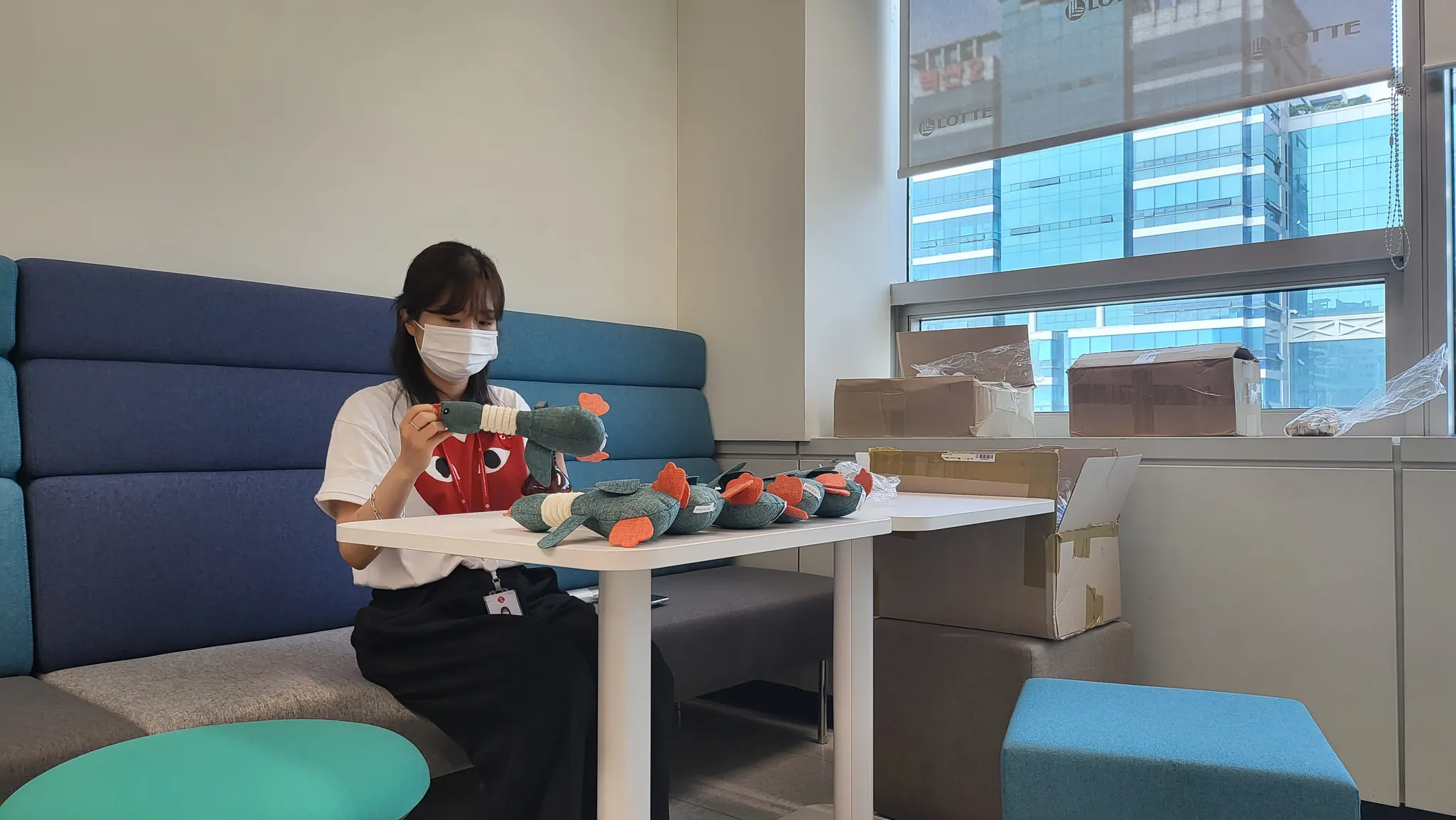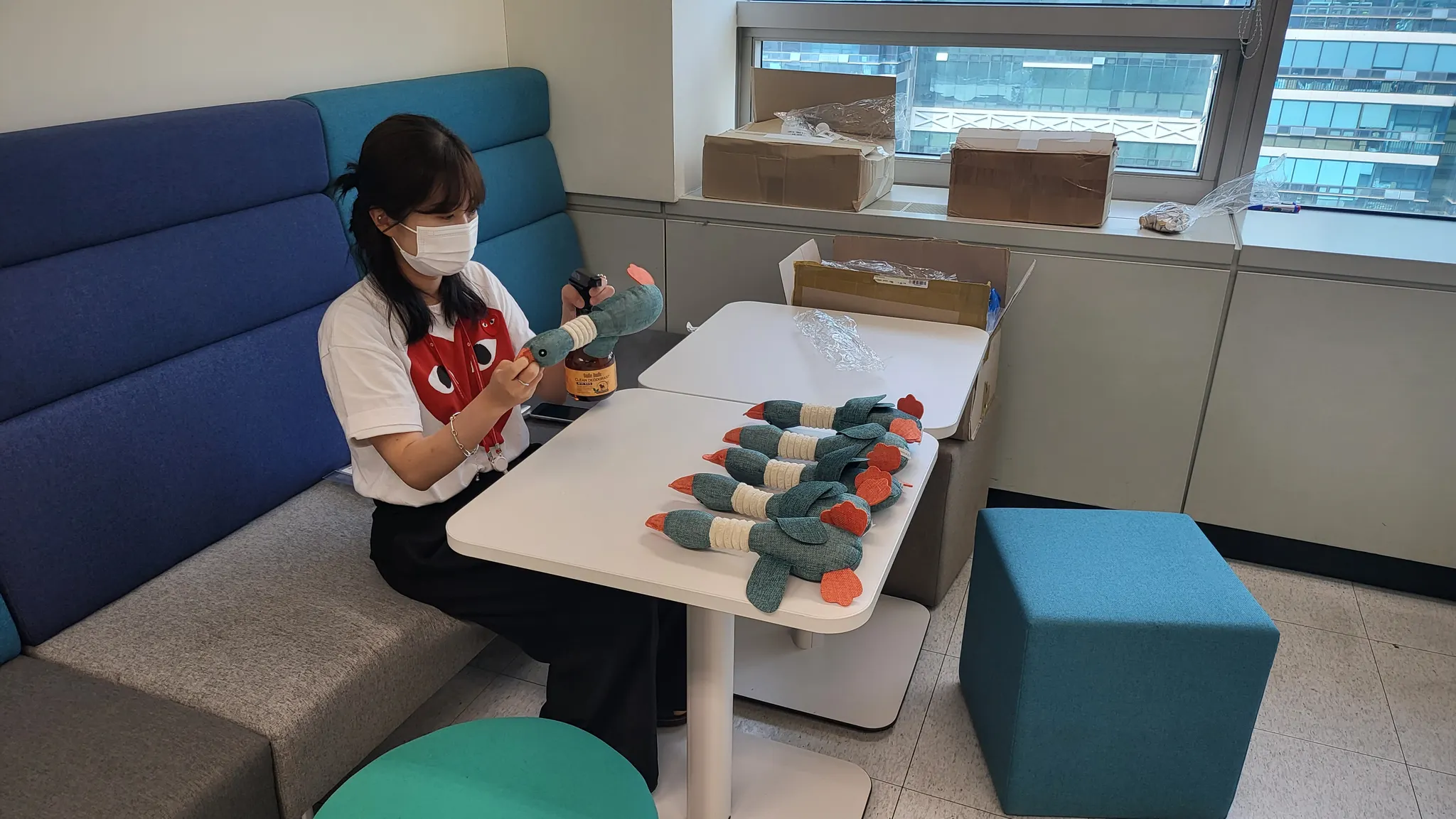 주문한 기러기 인형을 하나씩 반려동물 전용 탈취제로 냄새 제거를 했고 따로 포장까지 했답니다. 사진처럼 우리 팀원 Jina님이 열심히 탈취제를 기러기 인형에 뿌리고 있어요.