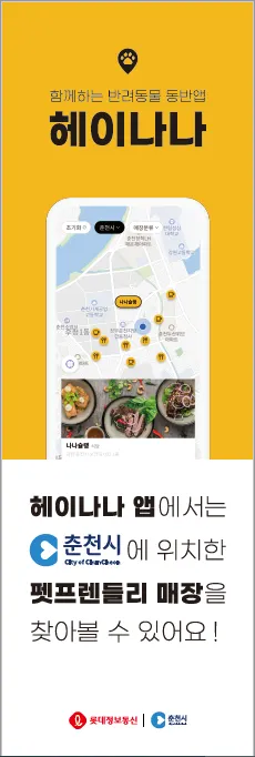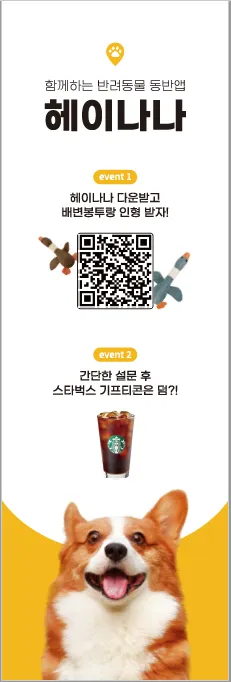 춘천시에서도 댕댕여지도 홍보 및 반려동물 인식표로 활용할 수 있는 자수 이름표 증정 이벤트를 준비하고 있어 반려동물 서비스인 헤이나나도 어렵지 않게 이벤트 주제를 정할 수 있어어요.(사실… 이미 다운로드 & 회원가입) 이벤트를 생각하고 있었지요.