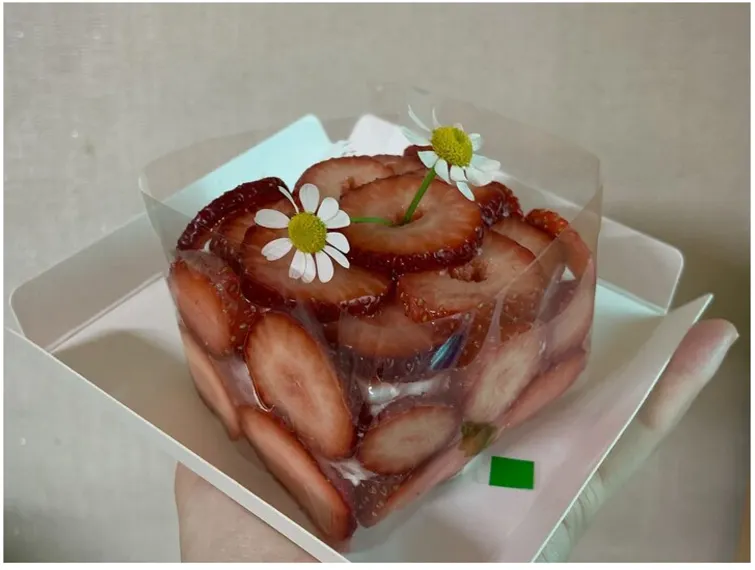 주문한 딸기 큐브 케이크예요! 겉면에 딸기가 가득 붙어 있고 시트는 쌀로 만들어져 독특한 식감이 느껴진답니다. 특별한 날에 특별한 사람에게 선물하기에도 좋아 보였어요.