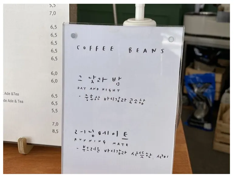 그 낮과 밤에 나의 러닝메이트가 되어 준 그대와 함께 주문을 할 때 원두 선택지가 있는 걸 몰랐는데, 사장님의 설명 덕분에 제 입맛에 맞는 커피를 즐길 수 있었습니다. 어떤 원두가 자신에게 맞는 지 모를 때 추천을 받으실 수 도 있을 것 같아요. 그리고 이 곳 원두의 메뉴명이 너무 인상적이었는데요, 따로 놓고 보면 감성적인 이름일 뿐인데 둘을 합쳐 문장으로 만들어보니 나와 반려동물이 서로 주고 받을 수 있는 말이 되어 몽글몽글한 기분이 들었습니다.