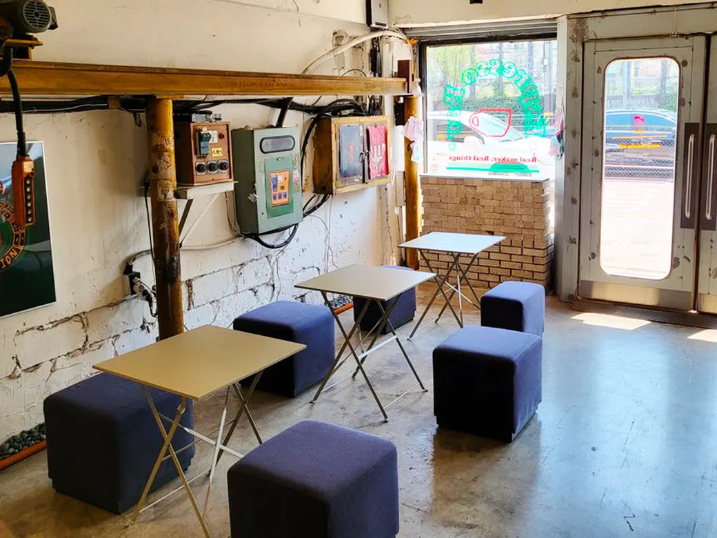 ‘문래방구’ 인근에는 제련소들이 많이 있는데요, ‘문래방구’도 과거 제련소이지 않았을까..? 싶습니다. 제련소에서 사용했던 물건들을 ‘문래방구’만의 오브제로 활용한 것 같아요! 이런 힙한 카페를 반려동물과 함께 방문할 수 있다고 하니 너무 좋네요.